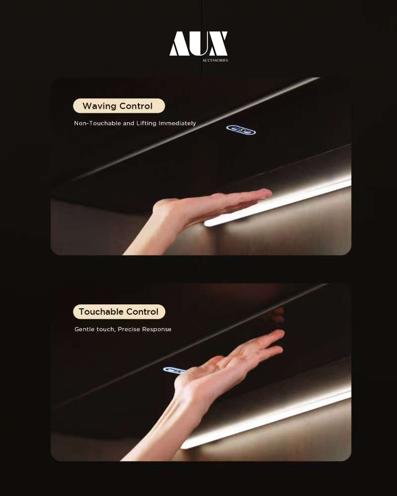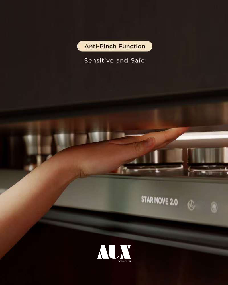 سبد بالابر AUX معمولاً با دکمه لمسی یا کنترل هوشمند عمل میکند. کاربر میتواند با فشار یک دکمه، قفسه را به سطح دلخواه بیاورد.
